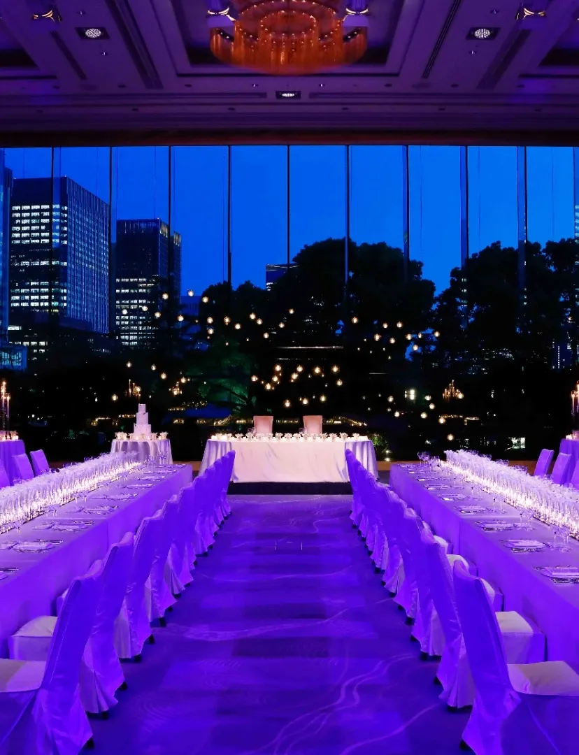 会場の壁や絨毯にお濠の水の調べを取り入れ、モダンなシャンデリアと融合しました。