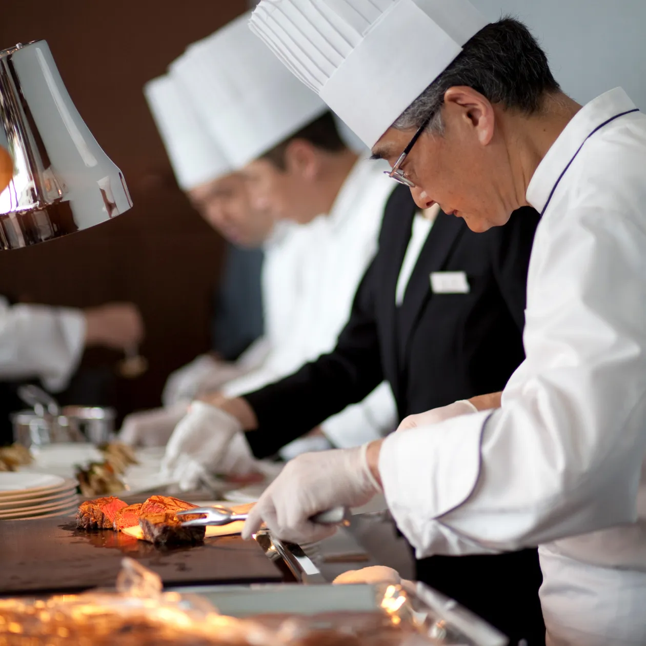 フランス語の「Cuisine (キュイジーヌ) =料理」と「Cuire (キュイール) =火を入れる」は、ラテン語の同じ語根から派生した言葉。その語源が示すとおり、お料理にとって火は重要な存在です。大人数の披露宴においても、お一人おひとりに最高のお料理をお届けできるように。シェフが常に全体の状況を把握し、ベストな火入れの瞬間と加減を判断します。