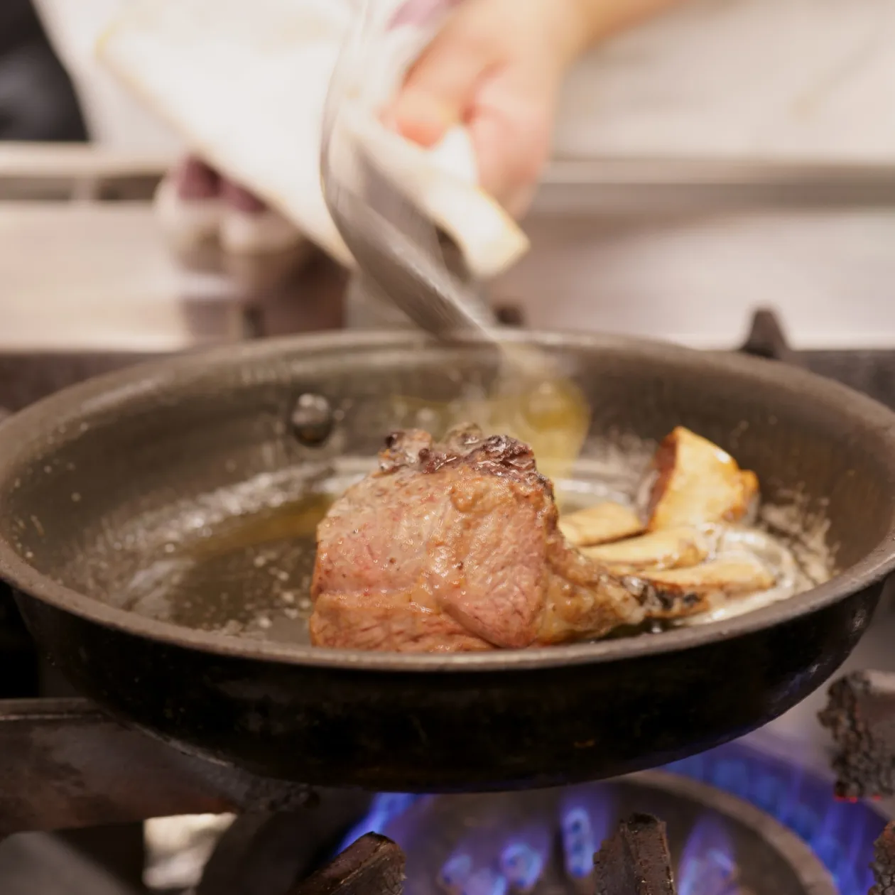 たとえば、ゲストのお席で熱々のスープを注ぎ入れたり、目の前でお肉料理の最後の盛り付けをするのは、立ち上がる香りや心地よい音を楽しんでもらいたいから。一皿が完成していく時間までをも味わっていただくためです。こうした動きのある演出は、お料理の美味しさにいっそうの奥行きをもたらすもの。それも大切なおもてなしのひとつです。