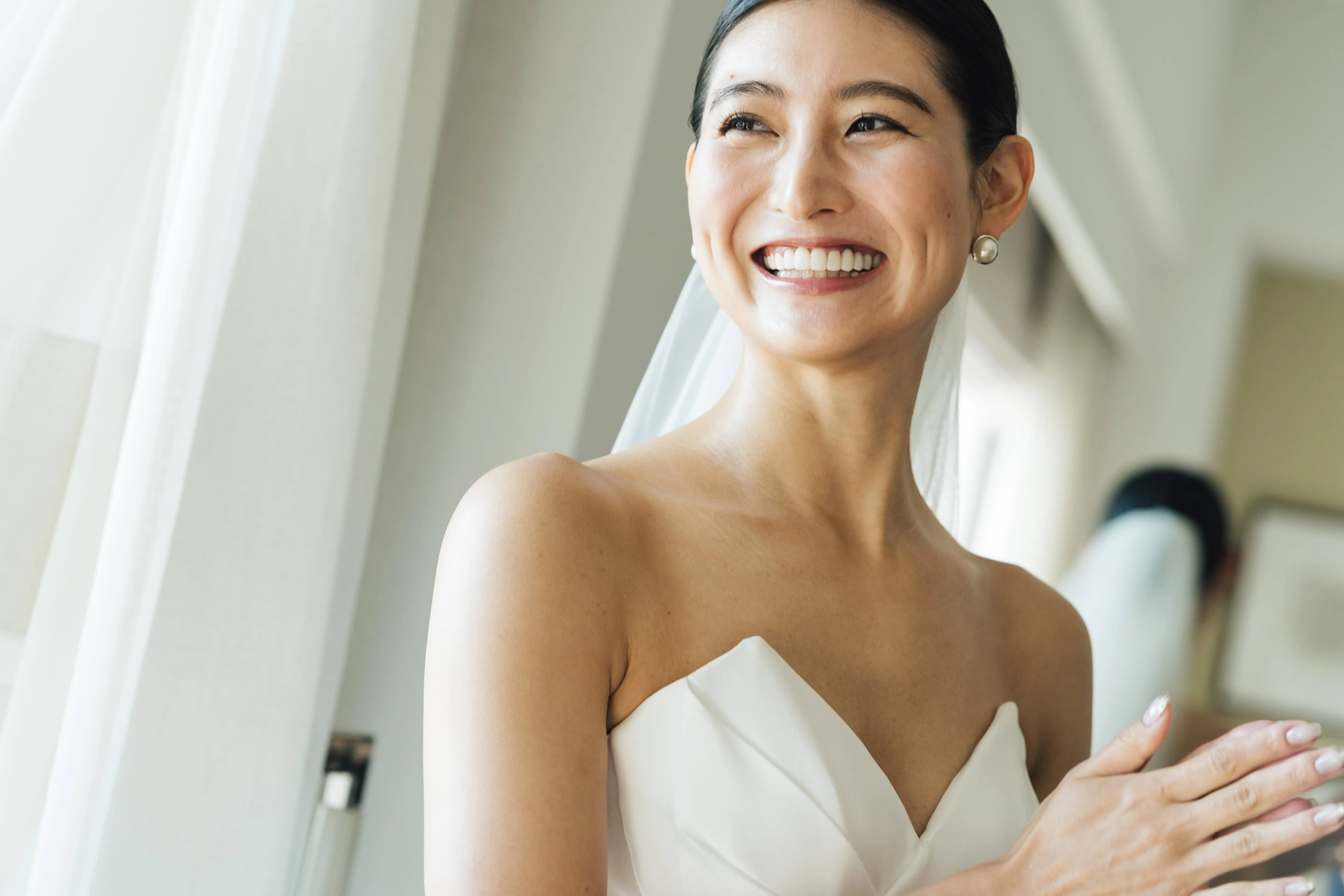 まさに聡明で美しく、凛とした佇まいのある里奈さんの魅力を引き立てる一着。