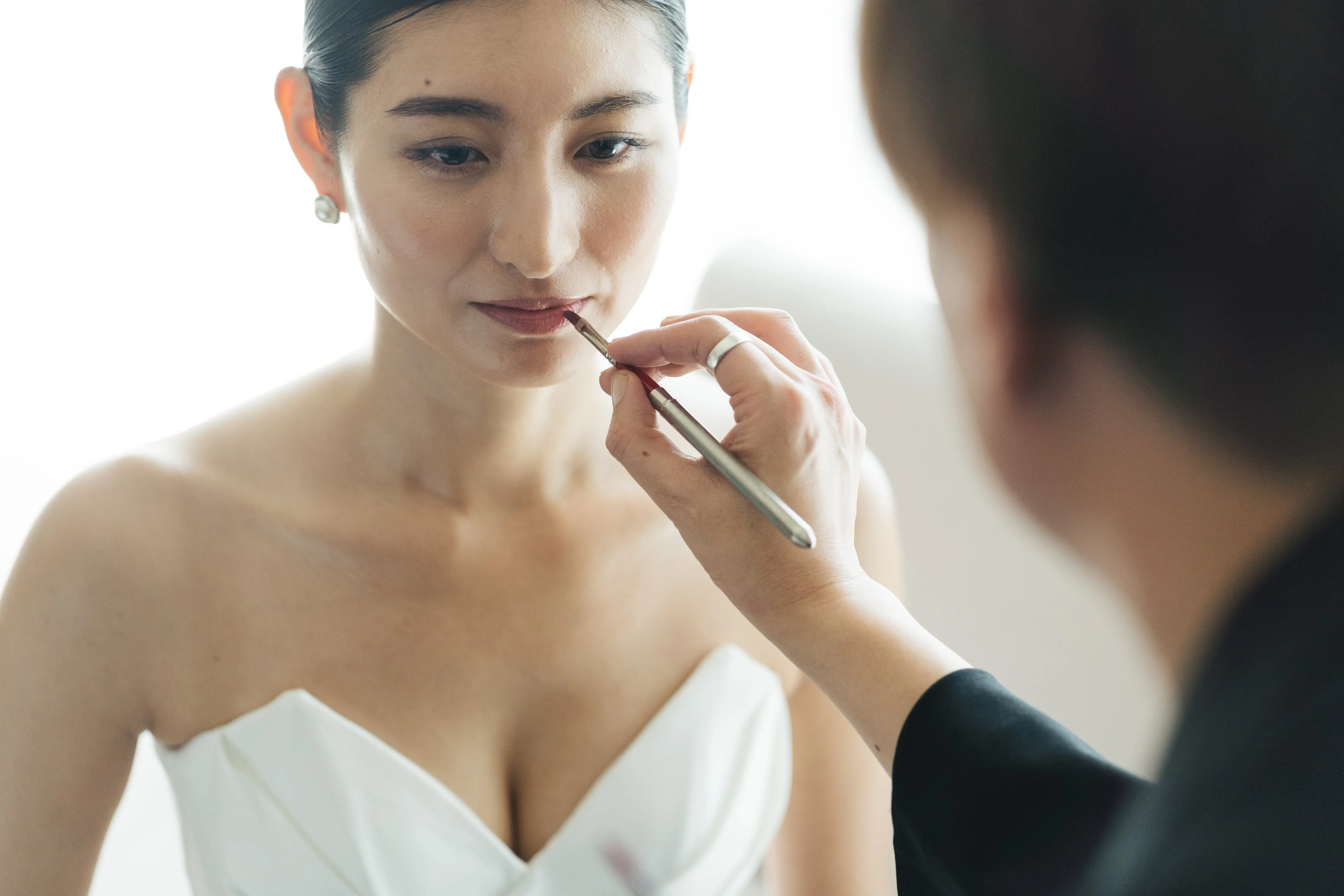 お色直しではリップカラーをブラウン味のあるレッドに変更し